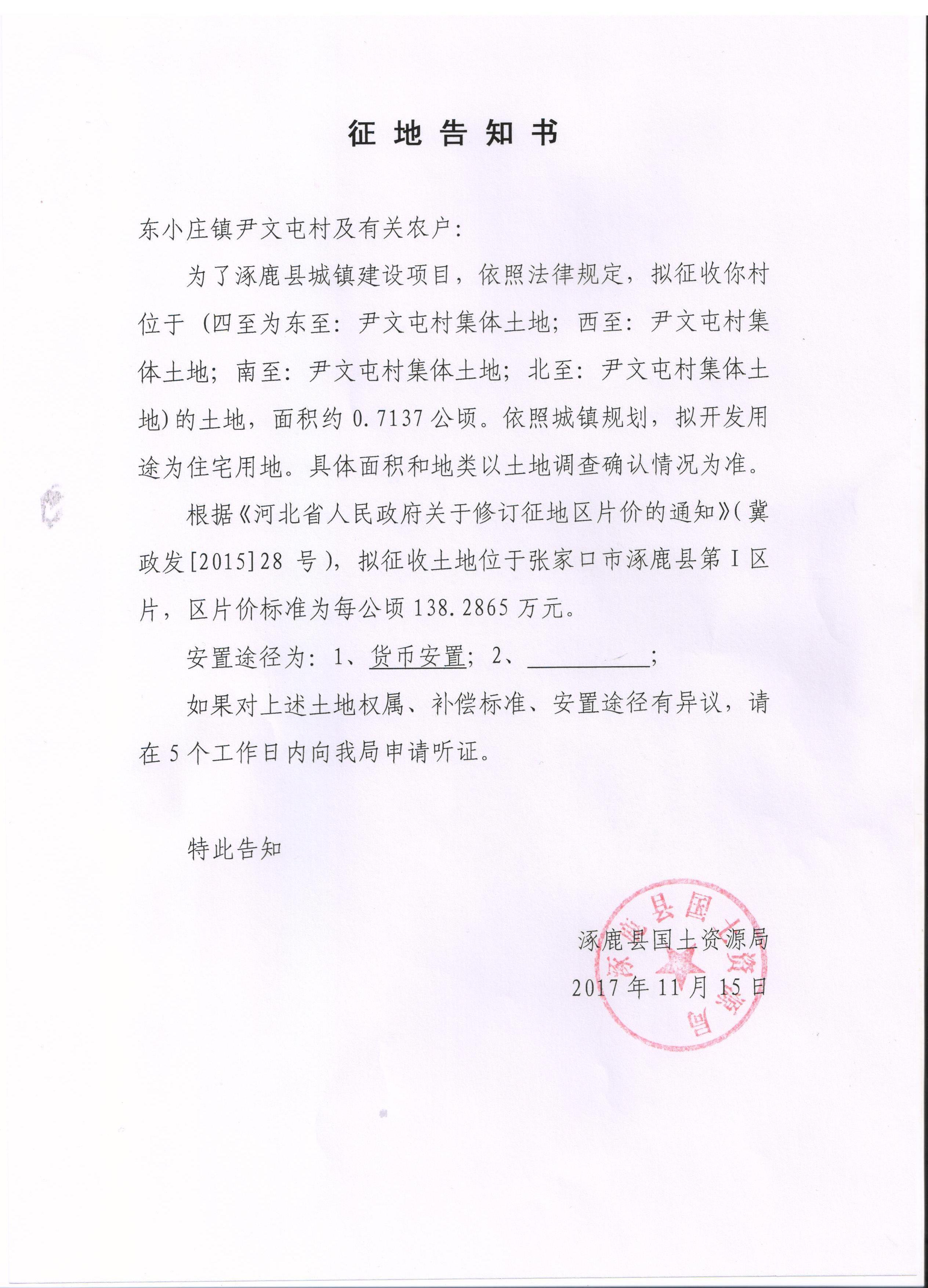 涿鹿县国土资源局征地告知书